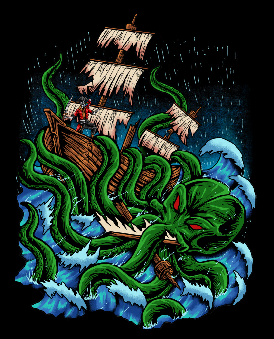 The Andiamo mentality T shirt combines comfort and style with its high-end, soft material and bold design featuring the LURKER, a kaiju octopus monster attacking a ship. Perfect for fans of the genre or those looking to make a statement.